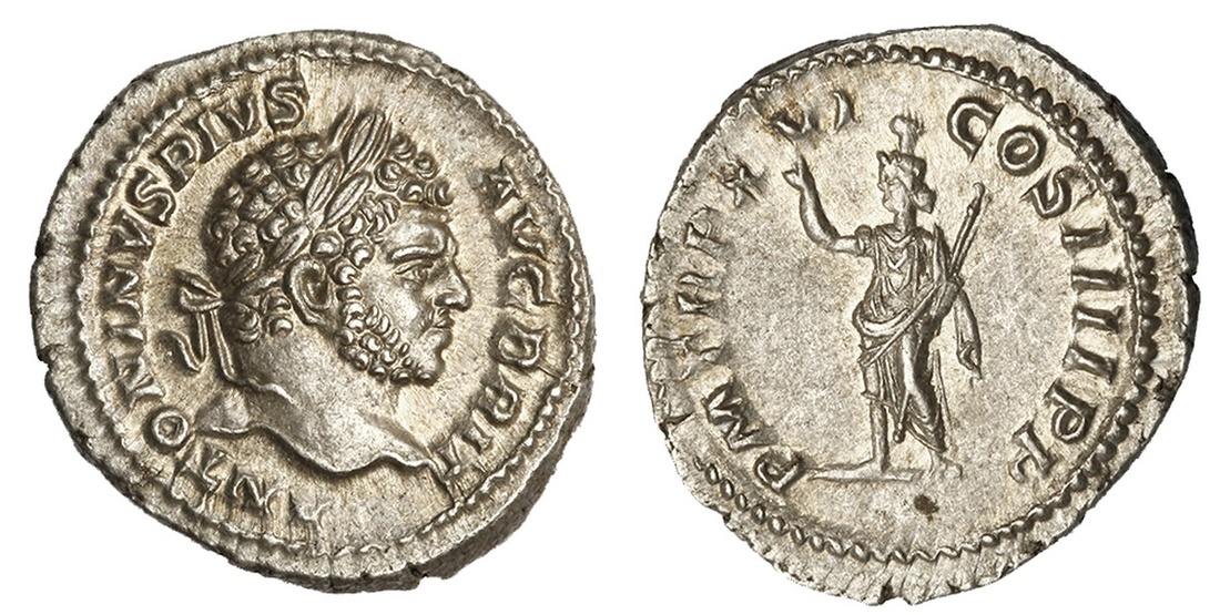 Roman Imperial. Caracalla (198-217). AR Denarius, 213. 3.77 gms. Laureate head right, rev. Serapis, wearing modius, standing, facing, head left, raising right hand and holdings scepter. RIC 208a. Bold portrait. Extremely Fine. Ex Stack's Auction, NY, Nov. 15, 1989, lot 401.