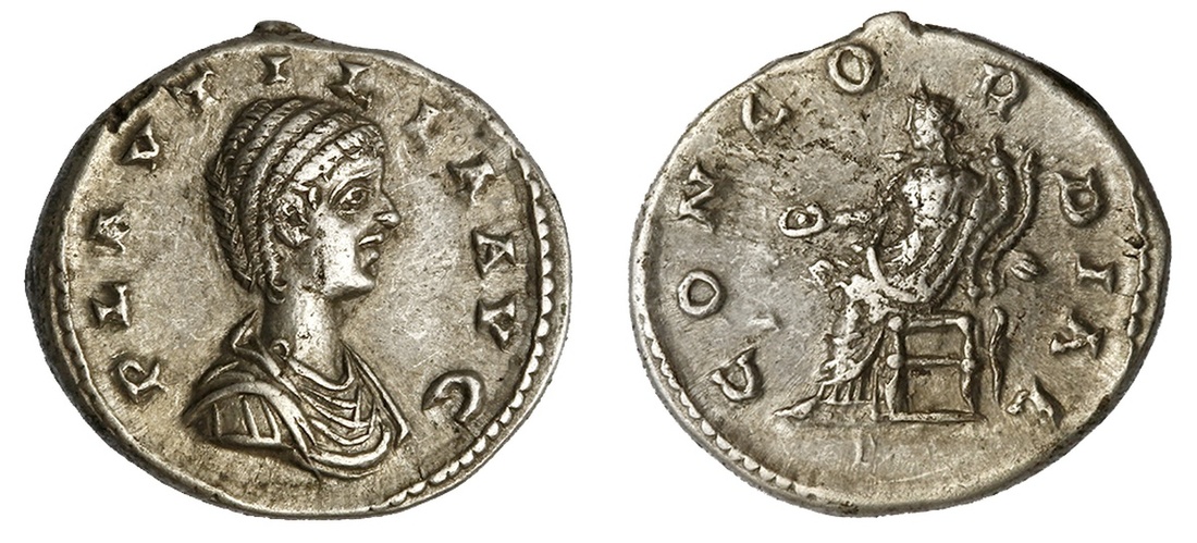 Roman Imperial. Plautilla, wife of Caracalla, Augusta (202-205). AR Denarius, 202. Laodicea ad Mare. 3.75 gms. Draped bust right, hair in plaits, rev. Concordia seated left, holding patera and double cornucopiae. RIC 370 (Caracalla), RSC 7. Near Extremely Fine.