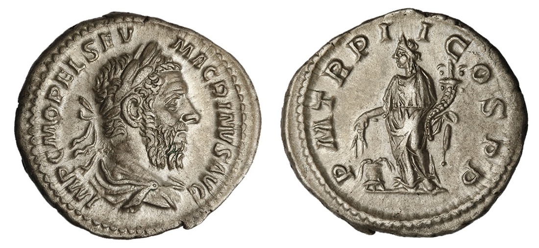 Roman Imperial. Macrinus (217-218). AR Denarius, 218. Rome, 4th officina, 3rd emission. 3.43 gms. Laureate, draped bust right, wearing long beard, rev. Annona standing left, holding cornucopia and grain-ears over modius. RIC 26. Extremely Fine.