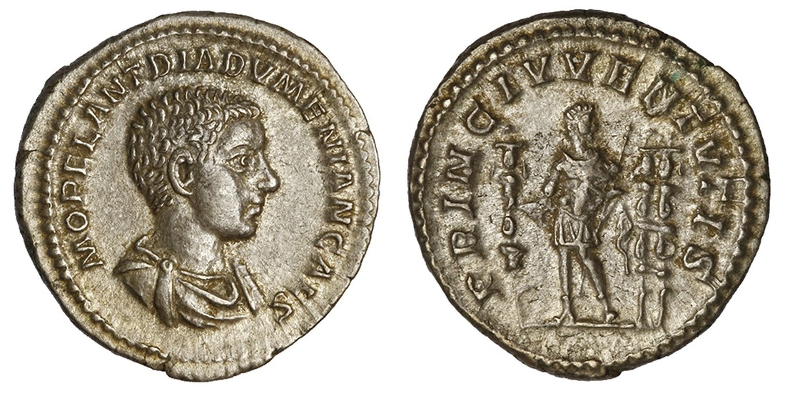 Roman Imperial. Diadumenian, Caesar (218). AR Denarius. 3.12 gms. Bare-headed, draped bust right, rev. Diadumenian standing half left, head right, holding a standard and scepter, two standards behind him. RIC 102 (Macrinus). Extremely Fine.