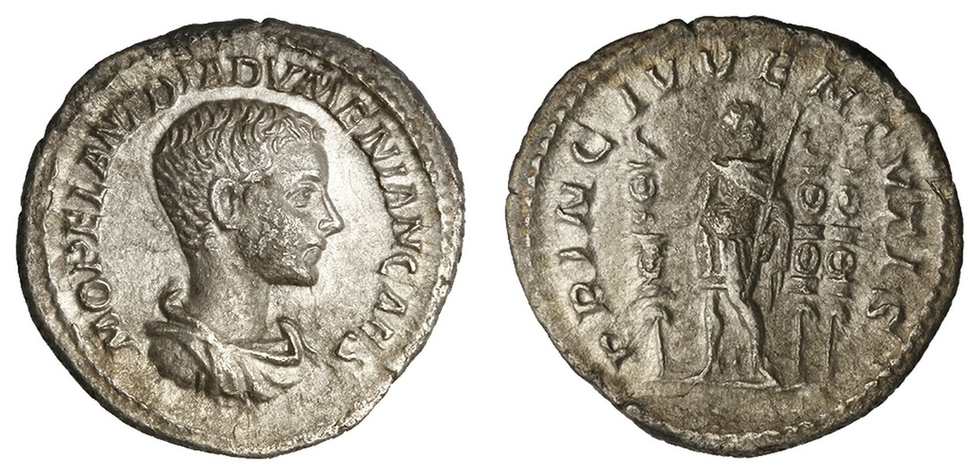 Roman Imperial. Diadumenian, Caesar (218). AR Denarius. 2.83 gms. Bare-headed, draped bust right, sideburns and light beard noticeablerev. Diadumenian standing half left, head right, holding a standard and scepter, two standards behind him. RIC 102 (Macrinus). Near Extremely Fine. Ex Stack's Auction, Feb. 21, 1990, lot 368.
