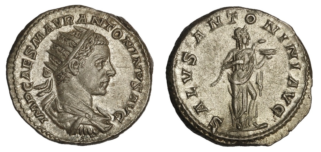 Roman Imperial. Elagabalus (218-222). AR Antoninianus, 218. 5.38 gms. Radiate, draped and cuirassed bust right, rev. Salus standing right, feeding serpent from patera. RIC 138. Choice Extremely Fine.