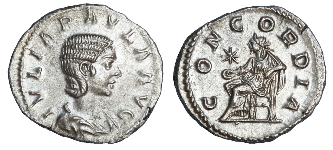 Roman Imperial. Julia Paula, 1st wife of Elagabalus (219-220). AR Denarius. 2.98 gms. Draped bust right, rev. Concordia seated left, holding patera, star before. RIC 211, RSC 6a. Slightly granular. Extremely Fine.