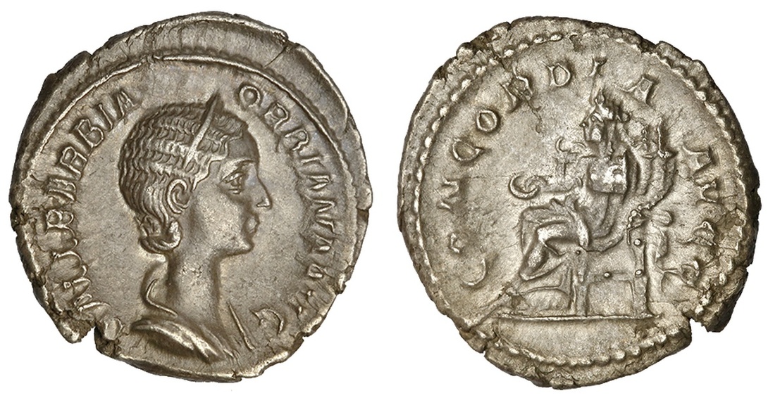 Roman Imperial. Orbiana, Augusta (225-227). AR Denarius, special Marriage Emission of Severus Alexander, 225. Rome. 2.77 gms. Draped bust right, wearing stephane, rev. Concordia seated left holding patera and double cornucopiae. RIC 319 (Alexander), RSC 1. Near Extremely Fine.