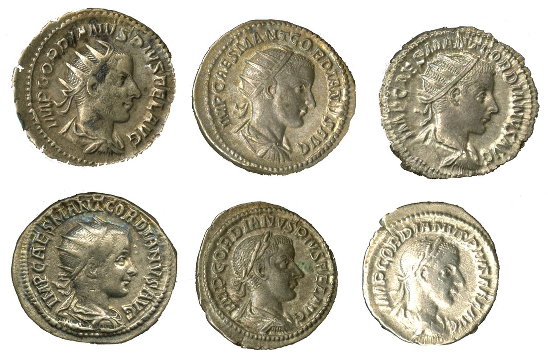 Roman Imperial. Gordian III (238-244). Silver lot. AR Antoniniani (4). Revs. Providentia standing left; Aequitas standing facing, head left; Roma seated left; and Apollo seated left. RIC 4, 34, 38, 89; and Denarii (2). Revs. Sol standing, head left; Diana Lucifera. RIC 111, 127. The second EF, the others VF-Good VF. (6)