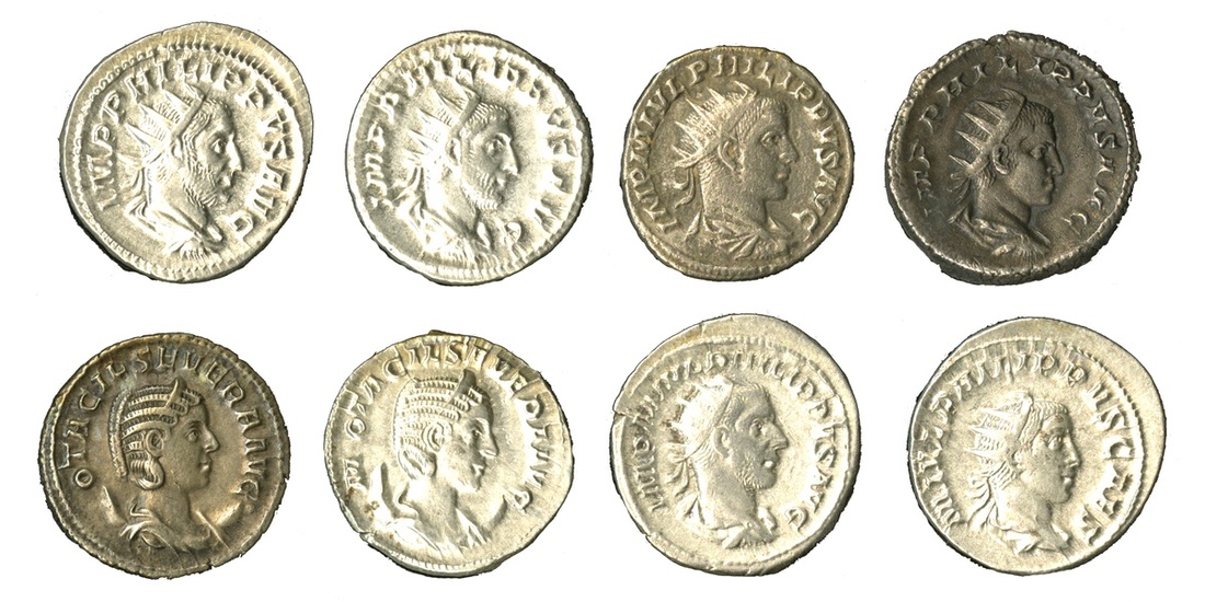 Roman Imperial. Philip I (244-249), and family. Octet of AR Antoniniani. Philip I (3). Revs. Laetitia left; Aequitas standing left; and Four standards. RIC 36b, 57, 62; wife Otacilia Severa, Augusta (2). Revs. Concordia seated left; Pietas standing left. RIC 125c, 130; son Philip II, as Augustus (247-249). Revs. Philip II standing left; Goat walking left - Iudi Saeculares issue; and Aequitas left. The last near VF, the others VF-EF. (8)