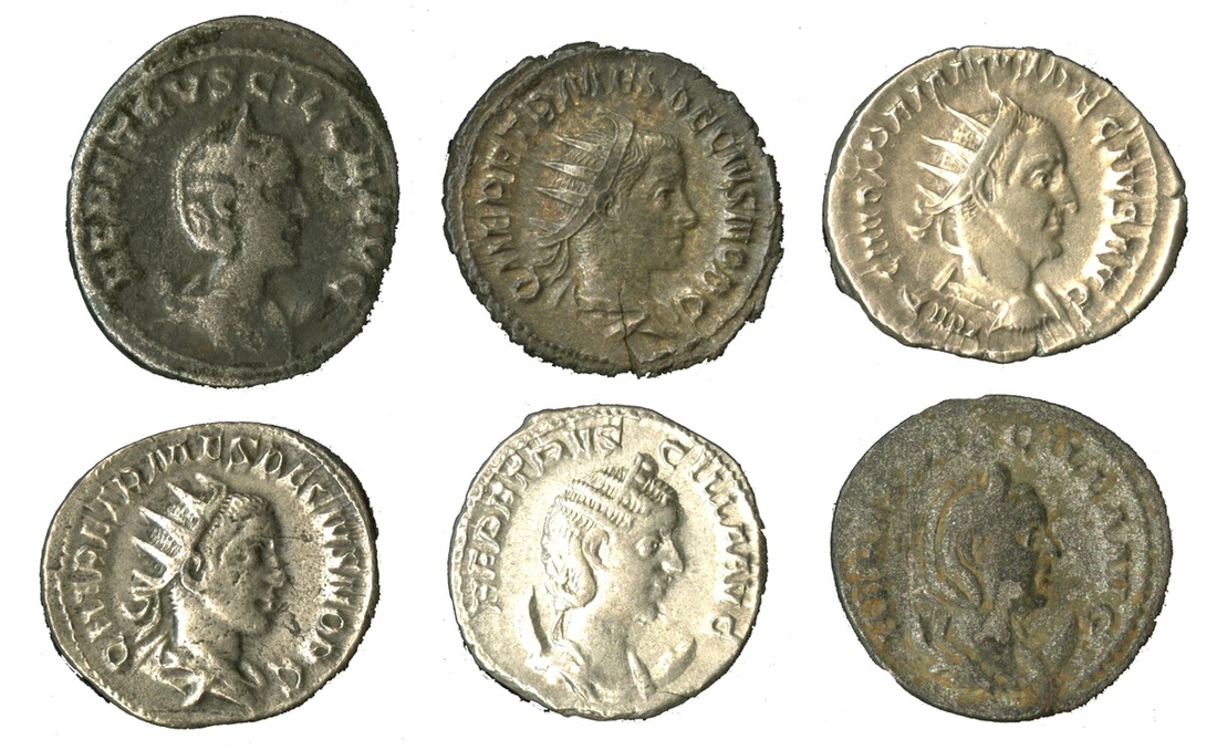 Roman Imperial. Antoniniani of Trajan Decius and family. Trajan Decius. Victory striding left reverse. RIC 29c; Herennia Etruscilla, wife, Augusta (249-251). Three reverse types - Fecunditas left with child, Victory striding left (muled with Decius reverse), and Pudicitia seated left (grainy). RIC 55b, --, 59b. The latter likely contemporary counterfeit, the mule possibly; Herennia Etruscus, son, as Caesar (250-251). Two reverse types -- Mercury standing left holding purse and caduceus; and Sacrificial implements (flan crack lower edge). RIC 142b, 143. Very Fine. (6)