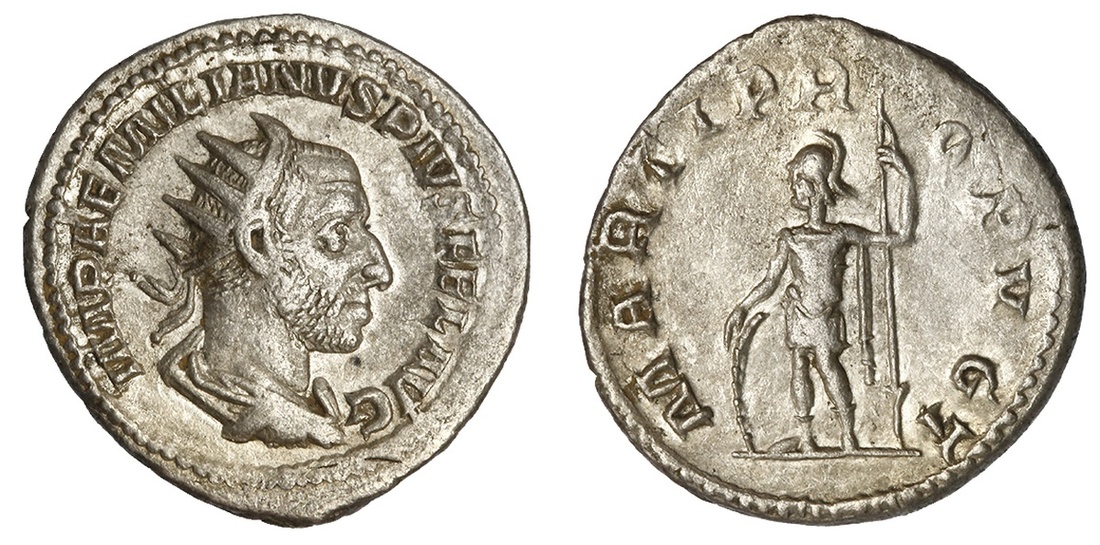 Roman Imperial. Aemilian (253). AR Antoninianus. 3.96 gms. Radiate, draped and cuirassed bust right, rev. Mars standing left, holding reversed spear, other hand on shield. RIC 6, RSC 25. Good Very Fine.