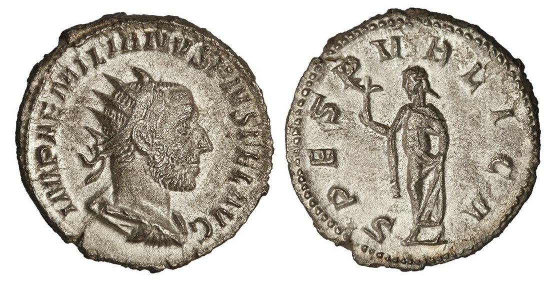 Roman Imperial. Aemilian (253). AR Antoninianus. Rome. 3.59 gms. Radiate, draped and cuirassed bust right, rev. Spes walking left, holding flower and slightly hiking skirt. RIC 10. Near Extremely Fine.