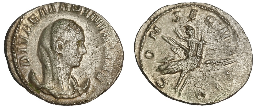 Roman Imperial. Diva Mariniana (died before 253). AR Antoninianus, second emission of Valerian, 253-254. Viminacium. 4.41 gms. Veiled and draped bust right set on crescent, rev. Apotheosis of Mariniana - Mariniana raising hand, reclining on peacock which flies heavenwards. RIC 6, RSC 16. Very slight porosity. Very Fine.