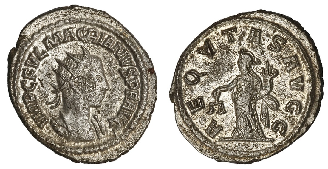 Roman Imperial. Macrianus, usurper (260-261). Billon Antoninianus, first emission. Samosata. 4.84 gms. Radiate, draped and cuirassed bust right, slight drapery, rev. Aequitas standing left. RIC 5, RSC 1var. Near Extremely Fine.