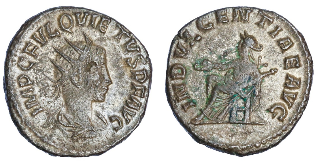 Roman Imperial. Quietus, usurper (260-261). Billon Antoninianus. Samosata. 3.38 gms. Radiate, draped and cuirassed bust right, rev. Indulgentia seated left, holding patera and scepter. RIC 5, RSC 6b. Very small shallow obverse pock. Good Very Fine. Ex Knobloch Collection.