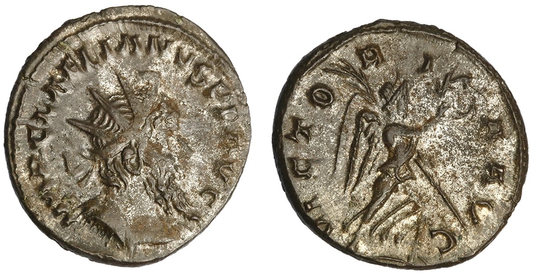 Romano-Gallic Empire. Laelianus, Usurper (269). Antoninianus, 3rd emission. Colonia Agrippinensis (Cologne). 3.70 gms. IMP C LAELIANVS PF AVG, radiate, draped and cuirassed bust right, curving at bottom left, rev. VICTO-RI-A AVG, Victory advancing right carrying wreath before her and palm frond over shoulder. RIC 9. Rare. Good amount of silvering remains. Extremely Fine.
