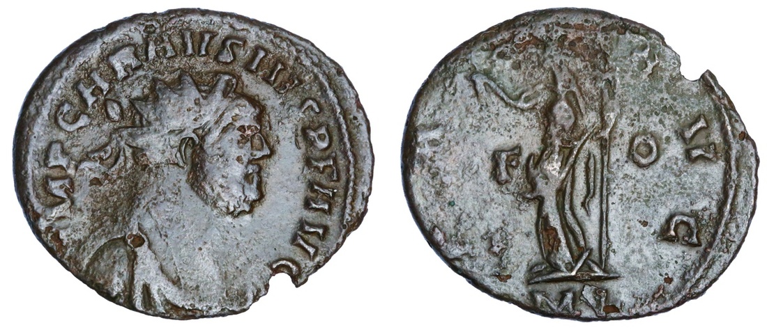 Romano-British Empire. Carausius (287-293). AE Antoninianus, 289. London. 3.94 gms. IMP CARAVSIVS PF AVG, radiate, draped and cuirassed bust right, rev. Pax standing left, F-O, ML in ex. RIC 101. Some roughness, oblong flan, irregular edge. Very Fine.