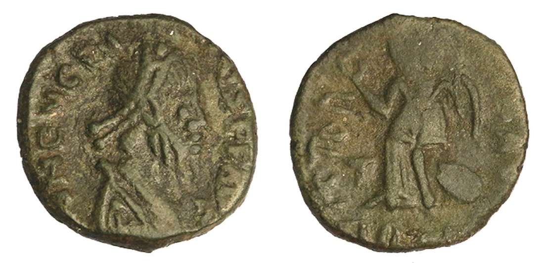 Roman Imperial. Western Empire. Eugenius (392-394). AE, 12.5mm. Trier(?) 1.31 gms. D)N EVGENI-VS PF AVG, pearl-diademed, draped and cuirassed bust right, rev. VICTOR-(IA) AVGGG, Victory advancing left, holding wreath, T before, R (occluded by filled die) behind, uncertain letter(s) in ex. Cf.RIC 107d. Sharp portrait for type. Olive-green. Very Fine.