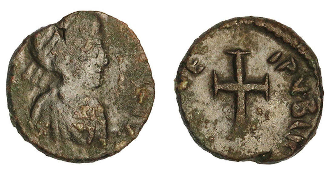 Roman Imperial. Western Empire. Galla Placidia, wife of Constantius III, Augusta (421-450). AE, 12mm. Rome. 1.29 gms. (DN GALLA PLA-)CID(IA) PF AVG, pearl-diademed, draped bust right, rev. (SALVS) REI-PVBLIC(E), Cross. RIC 2116. Rare. Very Fine.