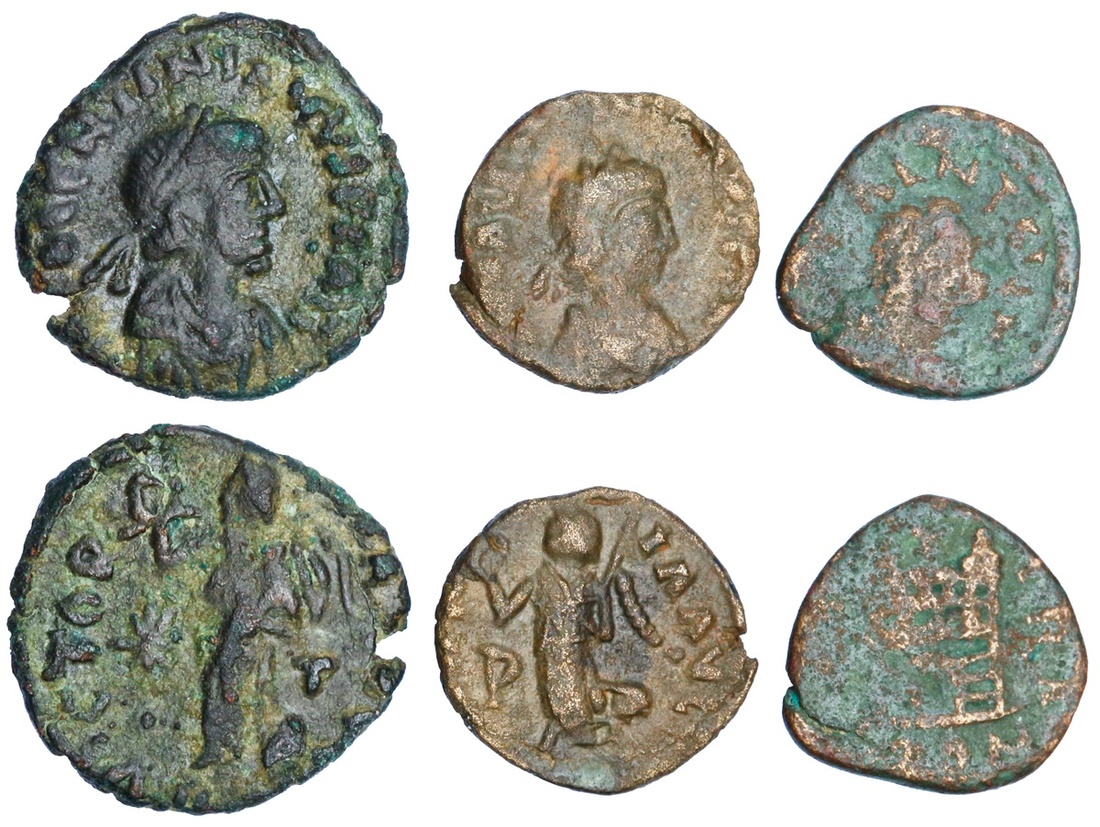 Roman Imperial. Western Empire. Valentinian III (425-455). Trio of Rome mint AEs: 14.5mm. Pearl diademed, draped and cuirassed bust right, rev. Victory advancing left, dragging captive, symbol left field. RIC 2138. Sea-green. VF; 12mm. Rev. Victory advancing left holding wreath and palm frond, P inner left field. RIC 2121. Brown. About VF; and 11mm. Rev. Gateway with turrets, RPM in ex. RIC 2123. Some roughness. Fine. (3)