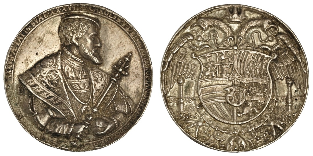 B>Austria. Holy Roman Empire. Karl V, Emperor (1519-1556). Cast Silver Medal, 1537. 62mm, 63.26 gms. By Hans Reinhart, the Elder. Later cast. CAROLVS.V. DEI. GRA.TI.A. ROMAN.IMPER.ATOR.SEMPER.AVGVSTVS.REX.HIS.ANNO.SAL.M.D.XXXVII.AETATIS.SVAE.X.X.XVI., Half-length bust right, holding orb and scepter, rev.Crowned Imperial double-headed eagle, elaborate Arms on breast, Collar of the Order of the Golden Fleece around, flanked by Pillars of Hercules and PLVS -VLTRA. Habich 1926, Löbbecke 564, Kress 606. Some tooling in fields. Near Extremely Fine.