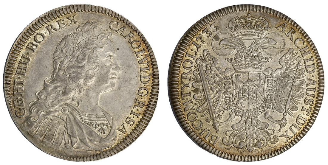 Austria. Karl VI (1711-1740). Taler, 1733. Hall. Laureate, draped and cuirassed bust right, rev. Crowned Imperial eagle with Arms. Dav.1055, KM 1639.1. Lovely golden highlights. Choice Uncirculated.