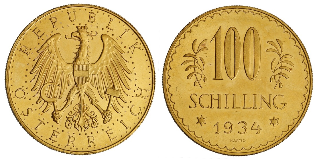 Austria. Republik. 100 Schilling, 1934. Eagle with Arms of the Republic, hammer and sickle in talons, rev. Value with spray. Fr.520, KM 2842. 9,383 pieces struck. Choice Prooflike Brilliant Uncirculated.