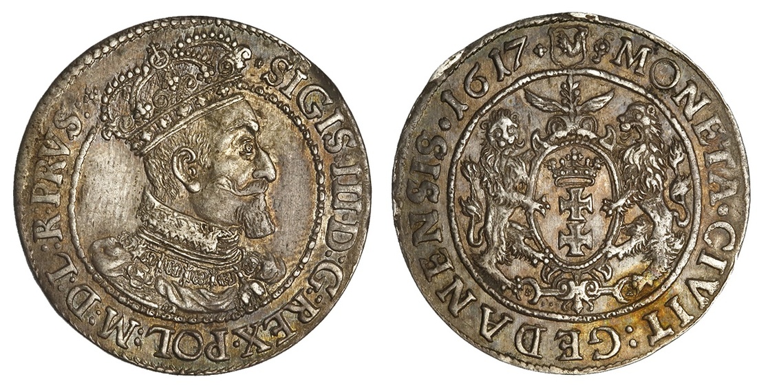 Danzig. Sigismund III (1587-1632). Ort, 1617 SA. Crowned bust right wearing Order chain, rev. Supported, oval City-Arms. KM 14, G.1391. Attractive amber hues. Very Choice About Uncirculated.