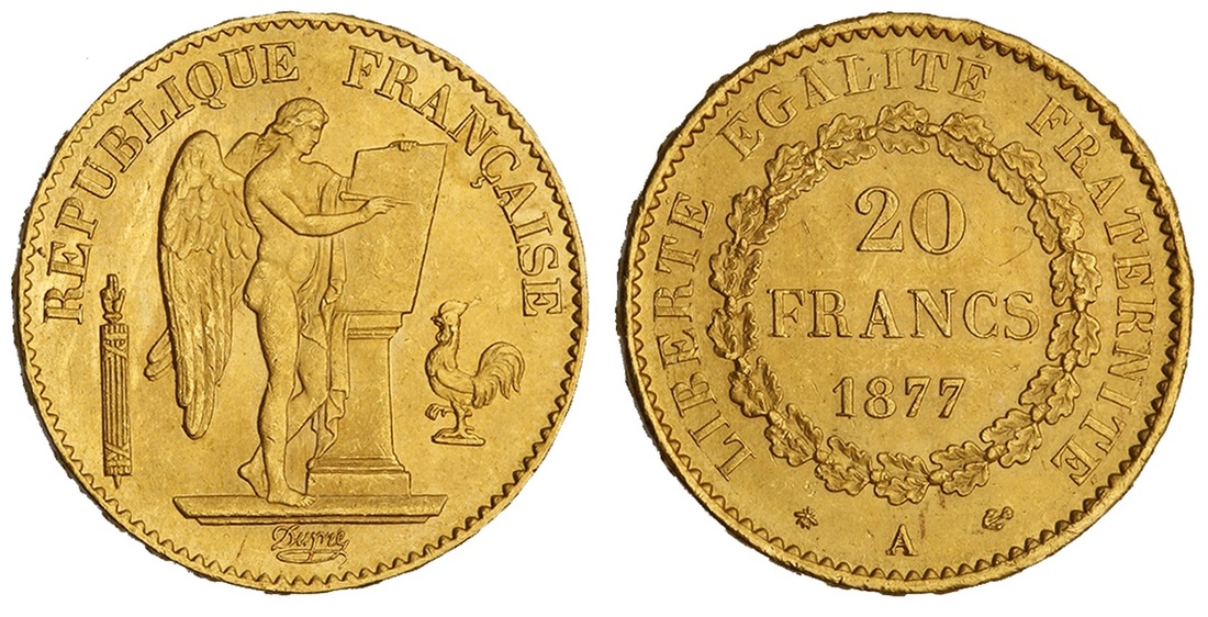 France. Third Republic. 20 Francs, 1877 A. Paris. Dupré's Genius inscribing Constitution, rev. Value and date within wreath. KM 825. Uncirculated.