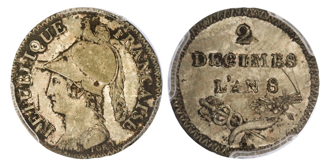 France. Consulate. Essai 2 Decimes, l'An 8. Minerva bust left, rev. 2 / DECIMES / L'AN 8. Maz-586 (R1). PCGS SP63.