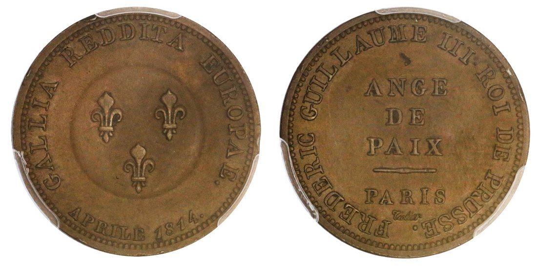France. Napoleon I. Essai 2 Francs, 1814. Bronze. Three fleurs de lis with globe, rev. FREDERIC GUILLAUME III ROI DE PREUSSE. ANGE / DE / PAIX / PARIS. Maz-772b (R1). Although listed as a R1 rarity by Mazard, such pattern example is seldom seen at auction and this one is the only one graded by PCGS so far.