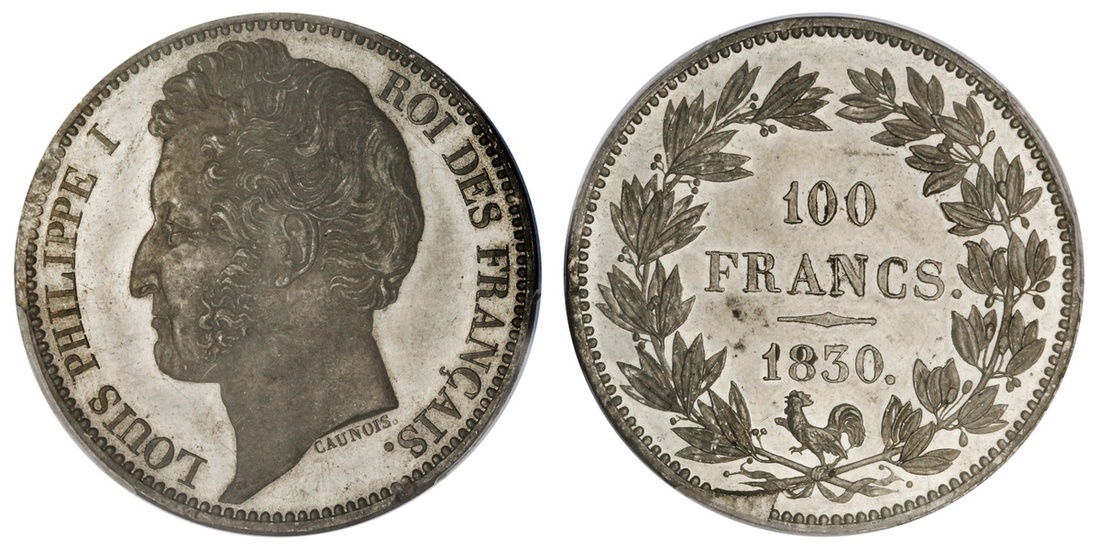 France. Louis Philippe I (1830-1848). Pattern Essai 100 Francs CAUNOIS, 1830. By Caunois. White Metal. Laureate head left, rev. Value and date within wreath. Maz-1056 (R1). PCGS SP 62.