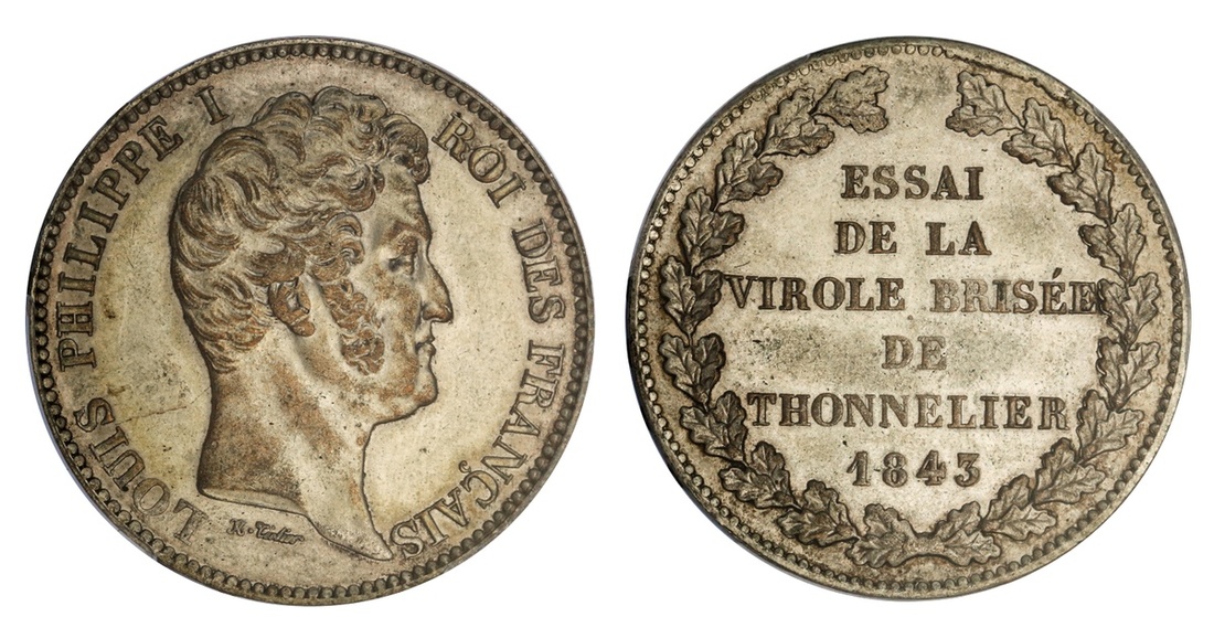 France. Louis Philippe (1830-1848). Essai 5 Francs, 1843. Silver-plated. Bare head right, rev. ESSAI / DE LA / VIROLE BRISEE / DE / THONNELIER / 1843. Maz-1156 var. PCGS SP Genuine. SurfPlated - AU Details.