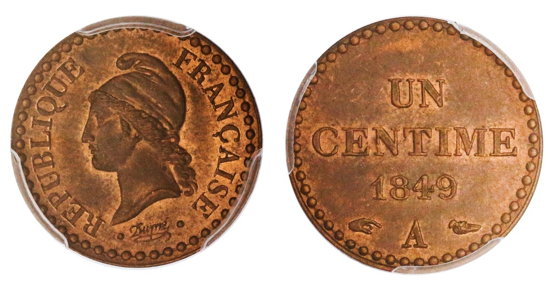 France. Second Republic. Centime, 1849 A. By Dupre. Capped Liberty head left, rev. Value and date. Gad. 84; F-101.2; KM-754. PCGS MS 65 BN.