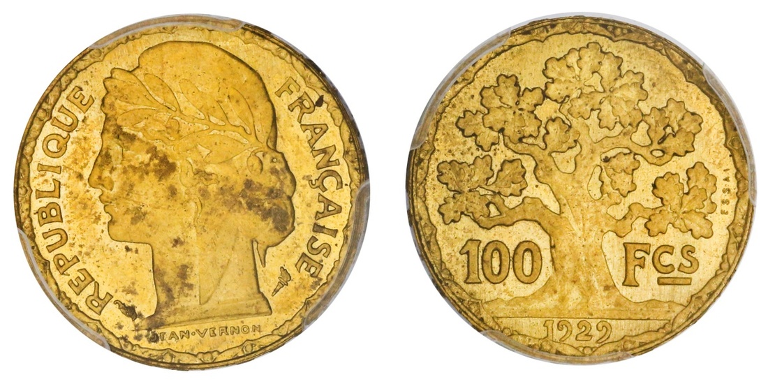 France. Third Republic. Pattern Essai 100 Francs VERNON, 1929. Aluminum-bronze. By Vernon. Liberty head left wearing wreathed cap, rev. Tree and value. Maz-2542a (R1). PCGS SP64.