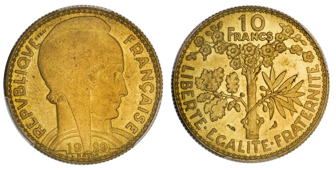 France. Third Republic. Pattern Essai 10 Francs BAZOR, 1929. Aluminum-bronze. 1929. By Bazor. Capped Liberty head right. Maz-2544a (R1). PCGS SP 65.