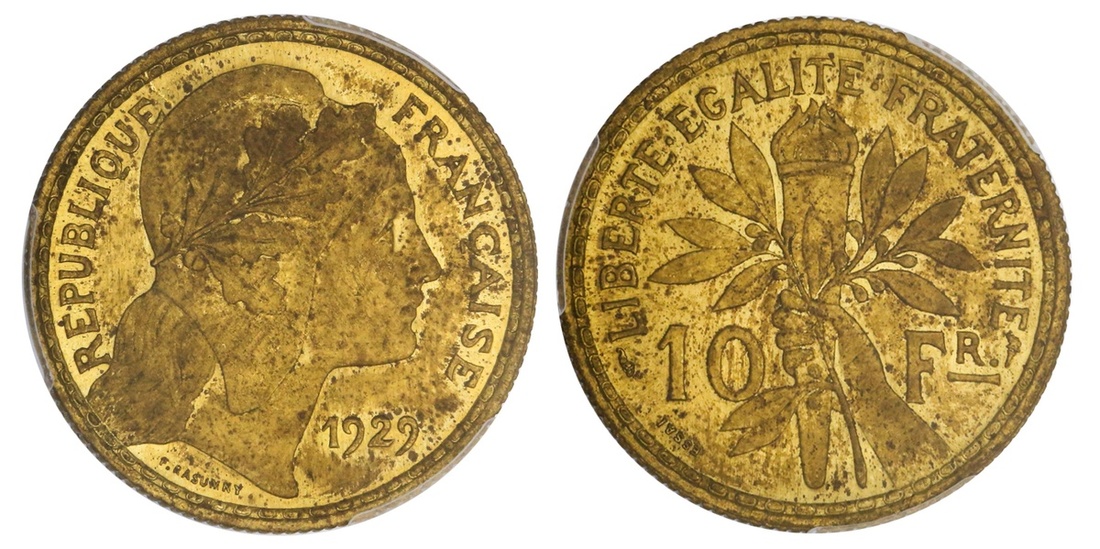 France. Third Republic. Pattern Essai 10 Francs RASUMNY, 1929. Aluminum-bronze. By Rasumny. Reeded edge. Liberty head right wearing wreathed cap, date before, rev. Hand holding torch. Maz-2551a (R1), GEM 168.3 PCGS SP 63.
