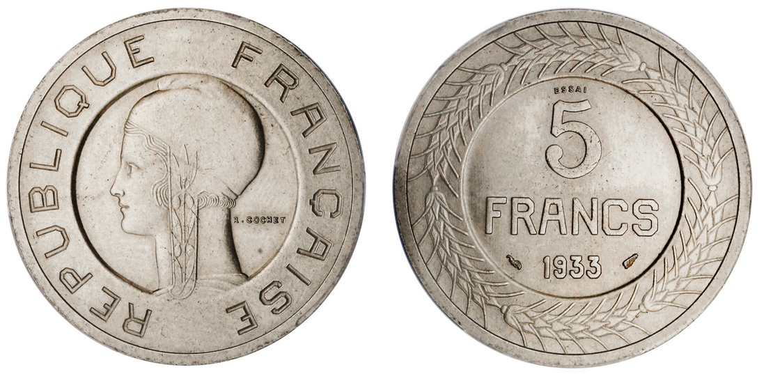 France. Third Republic. Pattern Essai 5 Francs COCHET, 1933. Nickel. By Cochet. Capped Liberty head left within recessed circle, rev. 5 / FRANCS / 1933 within wheaten wreath. Maz-2560 (R2). PCGS SP64. The highest graded by PCGS.