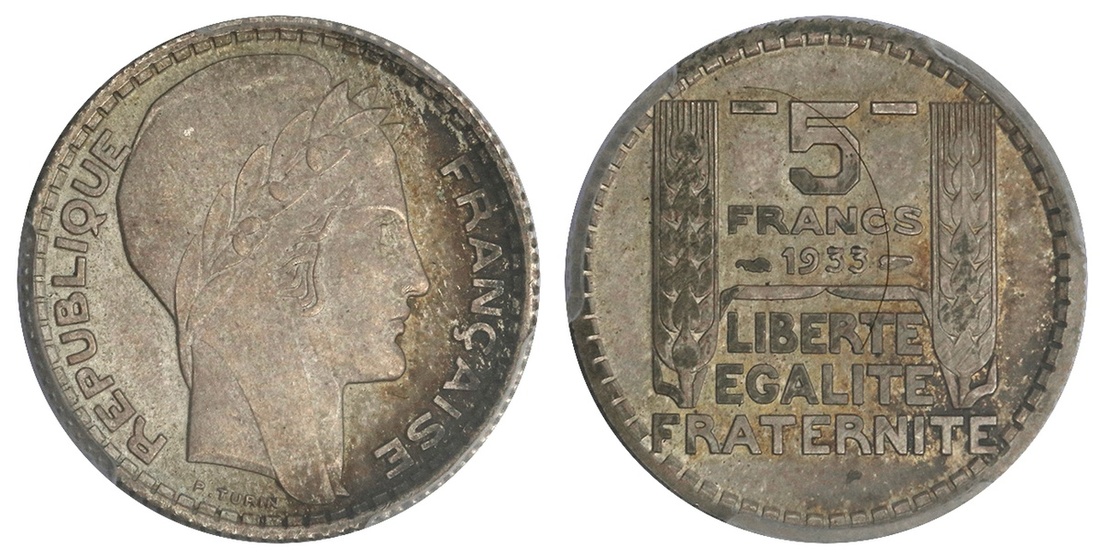 France. Third Republic. Pattern Essai 5 Francs TURIN, 1933. By Turin. Reeded edge, coin alignment. Liberty head right wearing wreathed cap, rev. Value, date and motto between wheat stalks. Extremely Rare Variety without the word "ESSAI". GEM-140.8.PCGS SP 66.