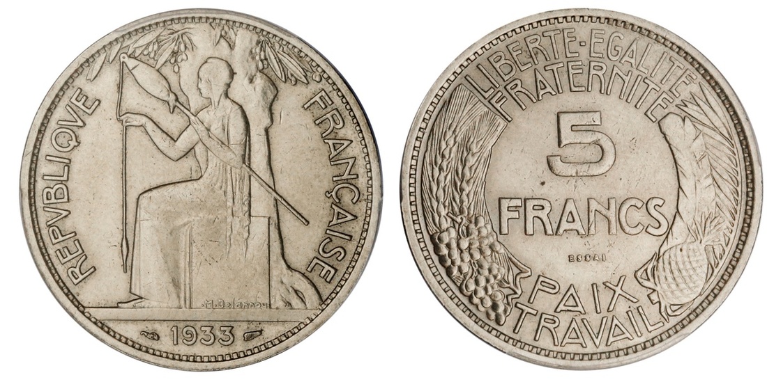 France. Third Republic. Pattern Essai 5 Francs DELANNOY, 1933. Nickel. By Delannoy. Liberty seated left, holding a spindle, date below, rev. LIBERTE . EGALITE / FRATERNITE . 5 / FRANCS / PAIX / TRAVAIL. Maz-2562 (R2). PCGS SP 63.