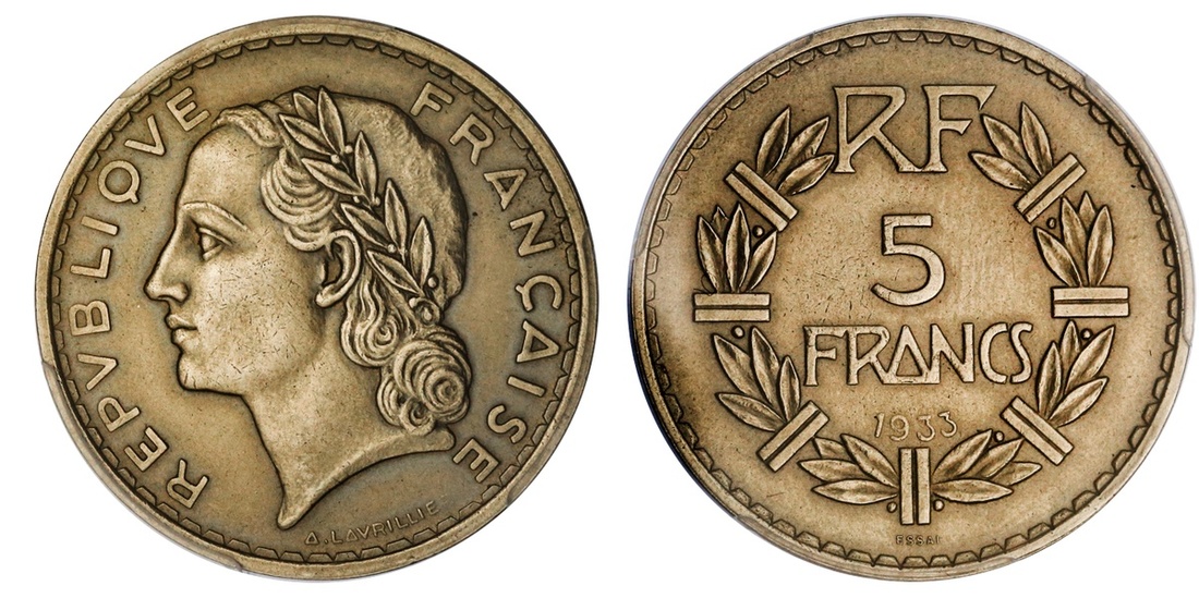 France. Third Republic. Pattern Essai 5 Francs LAVRILLIER, 1933. Nickel. By Lavrillier. Marianne head left, rev. RF, value and date within wreath. letters (right bar of the "R" diagonal). Maz-2563a (R2). PCGS SP64.