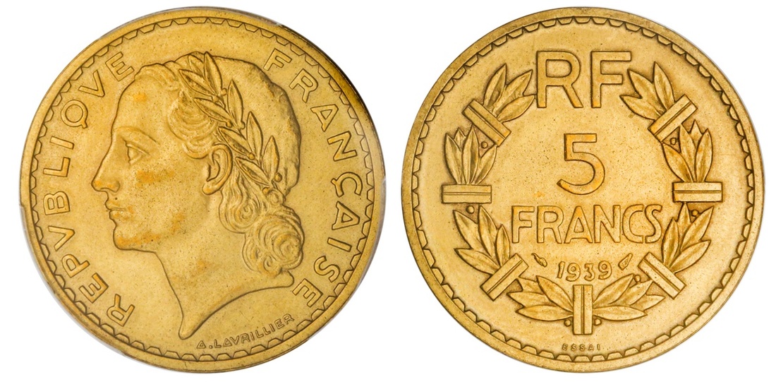France. Third Republic. Pattern Essai 5 Francs LAVRILLIER 1939. Aluminum-bronze. By Lavrillier. Marianne head left, rev. RF / 5 / FRANCS and date within wreath. Maz-2565, GEM 141.10PCGS SP64. Extremely rare example with fewer than 20 examples said to exist.