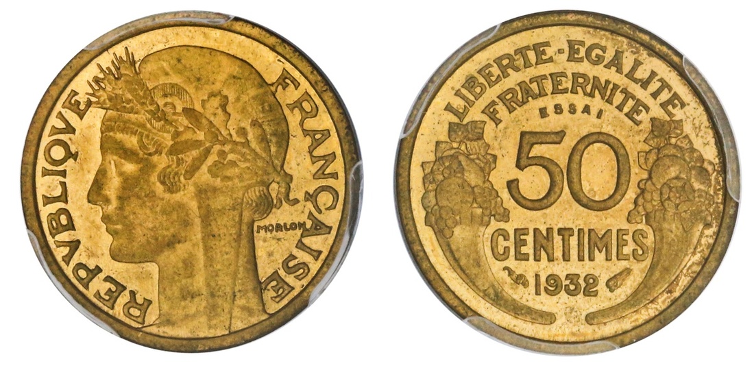 France. Third Republic. Pattern Essai 50 Centimes MORLON, 1932. Aluminum-bronze. By Morlon. Plain edge. Wreathed Liberty head left. Maz-2590 (R1). Adopted designs. PCGS SP 63.