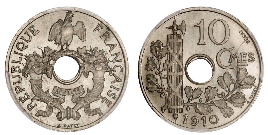 France. Third Republic. Pattern Essai 10 Centimes, 1910. Nickel. Rooster crowing above, central hole flanked by cornucopaie, rev. Fasces, value and date. Maz-2184 (R2). The highest pattern of this design graded so far by PCGS . PCGS SP 66.