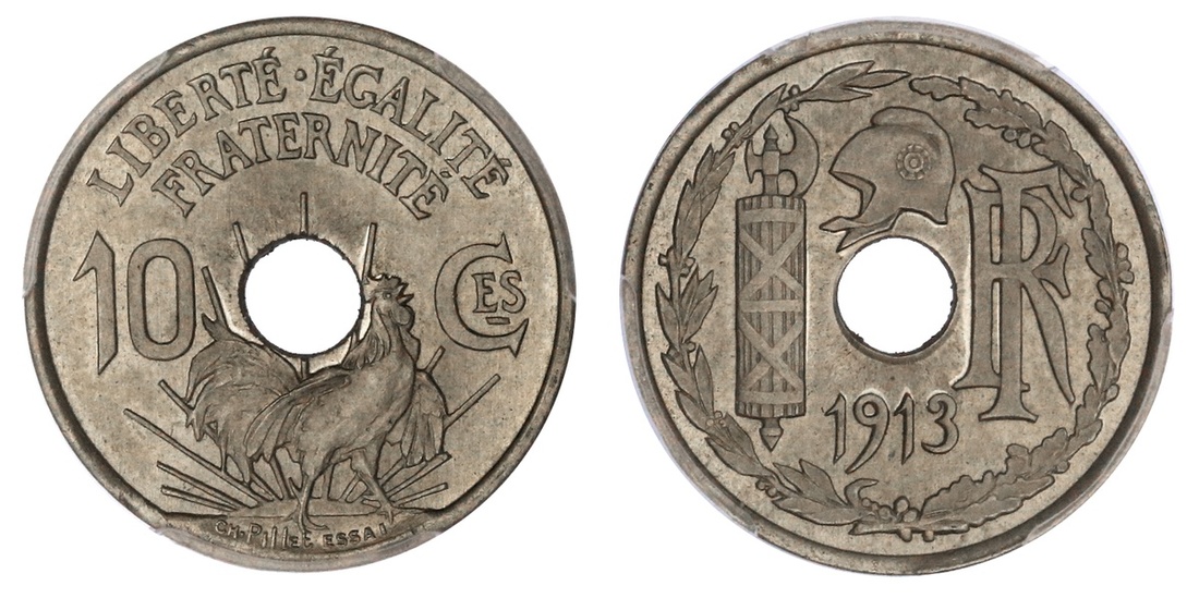 France. Third Republic. Pattern Essai 10 Centimes PILLET, 1913. Nickel. By Pillet. Plain edge. liberty cap above, fasces left, RF monogram right. Maz-2186 (R2). PCGS SP 67.