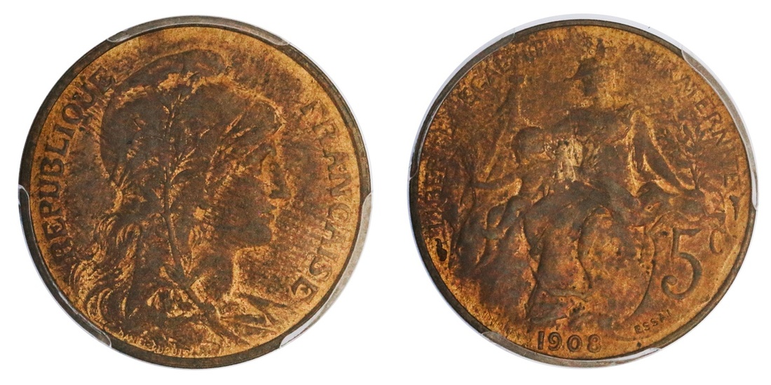 France. Third Republic. Pattern Essai 5 Centimes DUPUIS, 1908. Bronze. By Dupuis. Capped Liberty bust right, rev. France with child. GEM-14.19. Extremely rare Essai with less than 30 examples known. PCGS SP 64 BN.