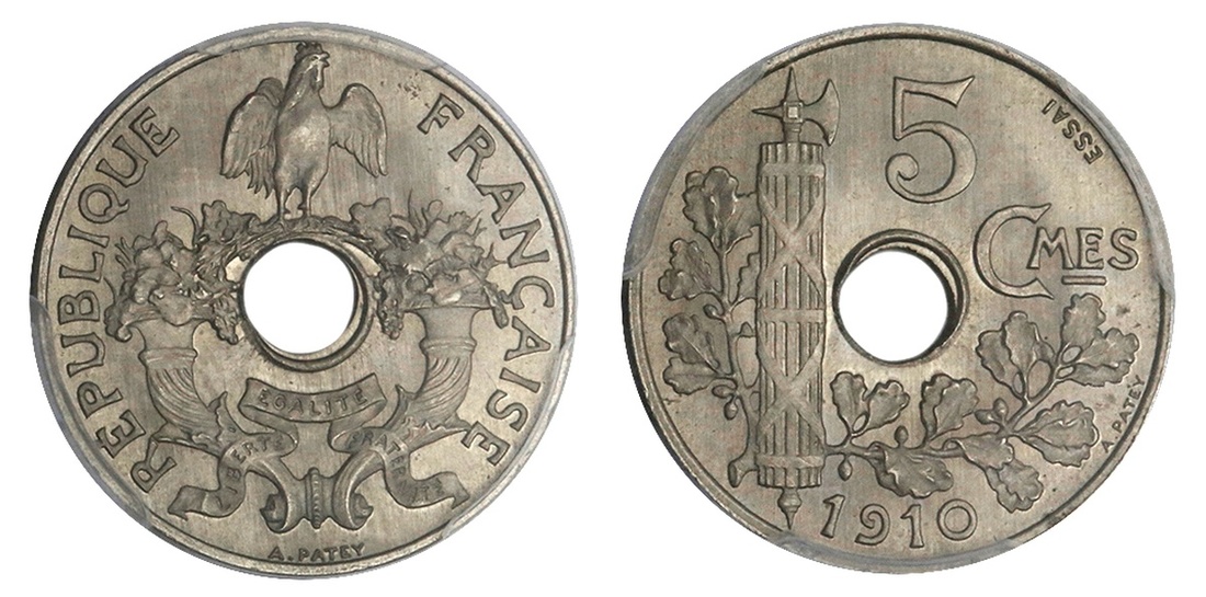 France. Third Republic. Pattern Essai 5 Centimes, 1910. Nickel. REPUBLIQUE FRANCAISE. Rooster above, central hole flanked by cornucopaie. Maz-2210 (R2). PCGS SP67+. Finest known to us.