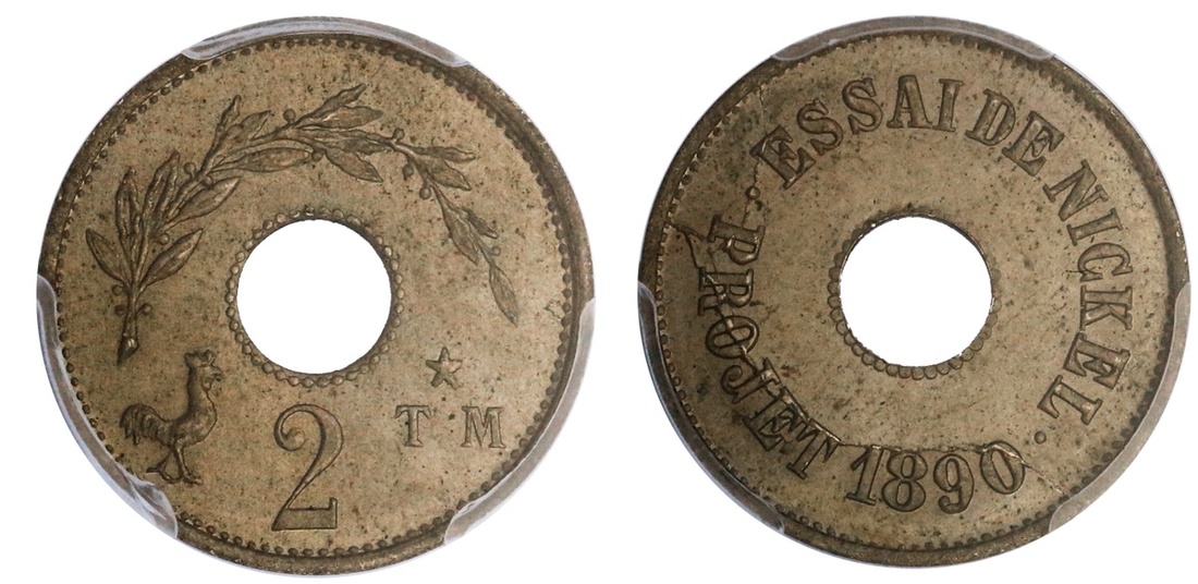 France. Third Republic. Pattern Essai 2 Centimes, 1890. Nickel. ESSAI DE NICKEL PROJET 1890, rev. Branch above, rooster and value below. Maz-2321 (R1). PCGS SP 64.