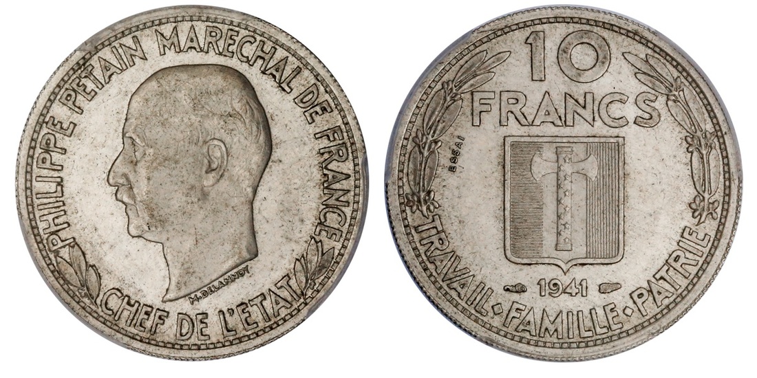 France. Vichy State. Pattern Essai 10 Francs DELANNOY, 1941. Aluminum. By Delannoy. Reeded edge. Petain head left, rev. 10 / FRANCS above shield, date below; TRAVAIL . FAMILLE . PATRIE at the bottom. Maz-2654b (R4), Gadoury Essais Monetaires GEM 175.3. Very Rare. PCGS SP 58.