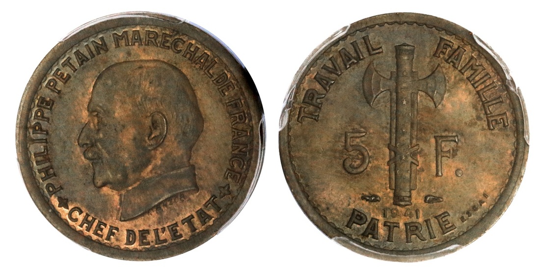 France. Vichy State. Pattern Essai 5 Francs BAZOR, 1941. Copper. By Bazor. Plain edge. Petain bust left. Rev. Fasces, 5-F; TRAVAIL FAMILLE PATRIE. GEM-1142.55. Very scarce variety. PCGS SP 62 BN.