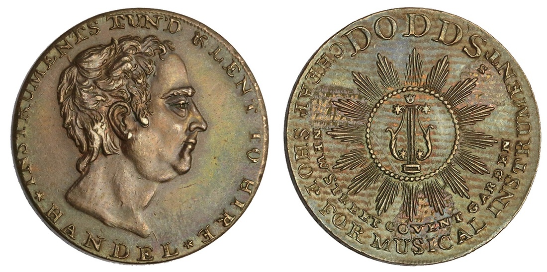 Great Britain, Middlesex, Dodd's, copper Halfpenny token, bust right, * handel * instruments tun'd & lent to hire., rev. harp in radiated circle, dodd's cheap shop for musical instruments new street covent garden, edge plain, thick flan (D&H 300), uncirculated
