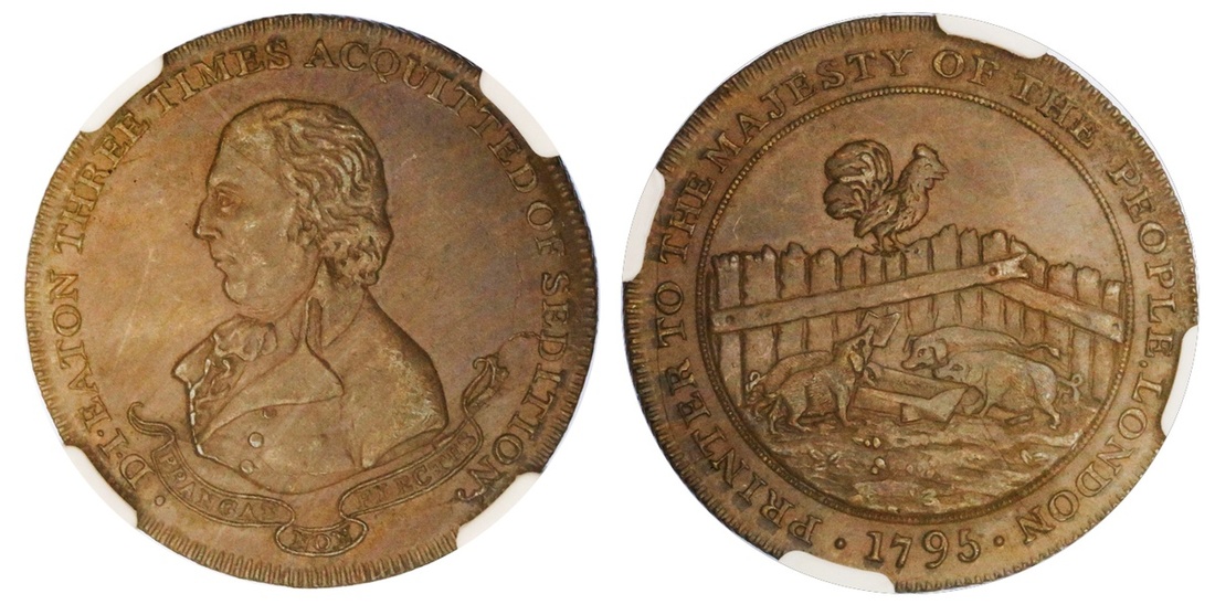Great Britain, Middlesex, Coventry Street, copper Halfpenny token, 1795, bust left, frangas non flectes on ribbon beneath, d. i. eaton three times acquitted of sedition, rev. cock crowing over pigs in sty, printer to the majesty of the people. london. 1795, edge milled (D&H 301), NGC MS 62 Brown