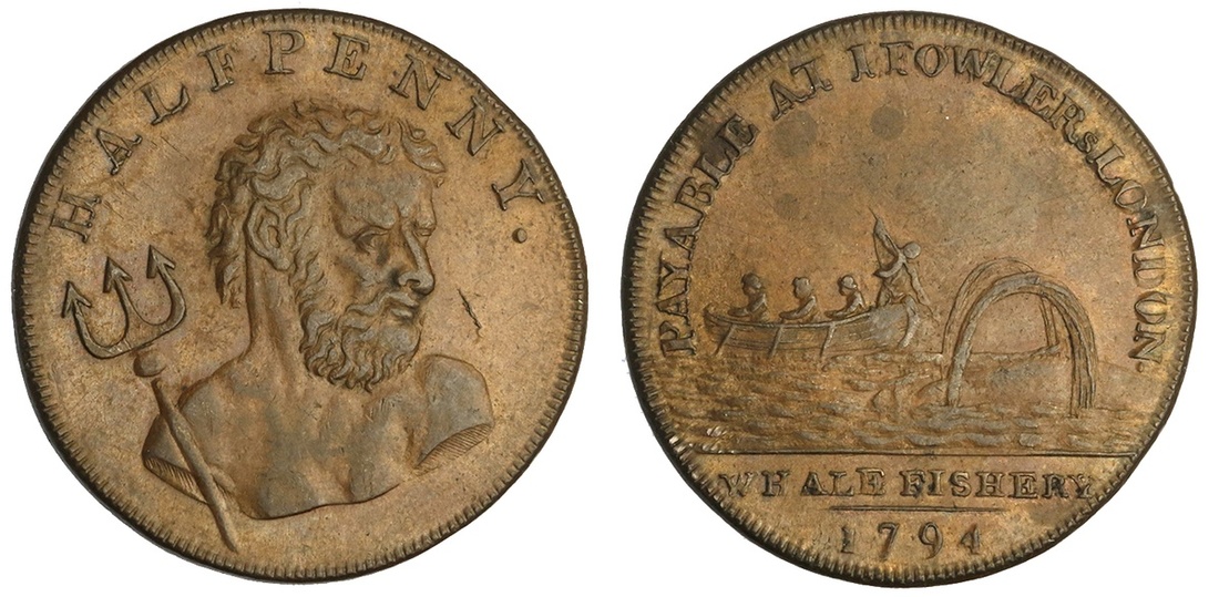 Great Britain, Middlesex, Fowler's, copper Halfpenny token, 1794, bust of Neptune with trident right, rev. whale fishery, payable at i. fowlers london, whale fishery and date in exergue, edge plain (D&H 306), good extremely fine